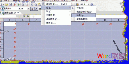 4、为了美观,我们可以把A1到I9的区域隐藏起来,具体操作如下:选中A1到I9的区域,单击格式菜单,在下拉菜单中选中“行”,在行中单击“隐藏”(如图3):