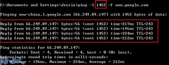 (1)点击开始-程序-附件-命令提示符,输入命令ping –l 14xx –f  www.google.com,l 14xx参数的意思是发送一个定长数据包,14xx是要测试的包大小。