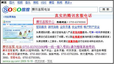 近期腾讯公司收到热心用户反馈的欺诈信息,发现这些案例中都出现了一些虚假的腾讯客服电话。我们根据不法分子惯用的诈骗手段整理了识别网络假冒腾讯客服电话的一些常见方式,请您仔细阅读,以防上当。 辨别方法:腾讯真正的客服电话为 0755-83765566 案例一: 欺诈者留下假冒的客服电话,甚至故意用短线拆分号码,增加迷惑性,比如:最近大量诈骗都利用海南区号0898进行诈骗。 假冒客服热线:089-8880-8XXX-XXXX,行骗者故意拆分号码,其实是:0898(海南区号)-8808XXXX(电话)-XXX (分机) 案例二: 使用网络搜索“腾讯客服电话”、“QQ客服电话”会出现(区号0898或020等)的假冒客服电话,请广大网民提高网络安全意识,注意识别假冒腾讯客服电话。 诈骗分子使用的0898开头的假冒腾讯客服电话: 诈骗分子使用的400开头的假冒腾讯客服电话: 诈骗分子使用的0755开头的假冒腾讯客服电话: 目前有部分用户不知道腾讯公司的客服电话,腾讯官方的建议是:登录腾讯客服网站获得正确的客服电话。 客服电话指引页面:http://service.qq.com/other/phone_flow.shtml 温馨提示: 如果您习惯用网络搜索查找腾讯客服电话,请注意辨别搜索结果的真伪。 您可以通过soso、百度等搜索引擎输入“腾讯客服电话”或“QQ客服电话”即可获得。